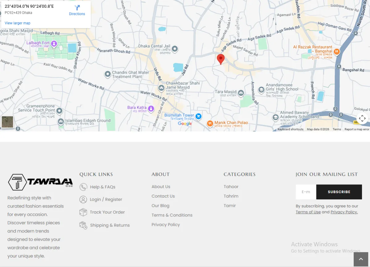 Beige/dark footer with logo, quick links (Help & FAQs, Login/Register, Track Order, Shipping & Returns, Terms & Conditions, Privacy Policy), categories (Tahoor, Tahrim, Tamir), mailing list signup ("Join Our Mailing List" with email input + Subscribe), social icons (implied), and copyright notice.