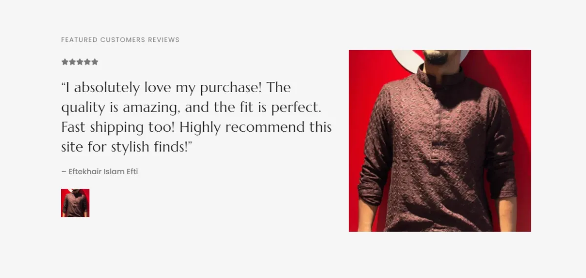 Highlighted customer testimonial section with 5★ quote from a customer praising quality, perfect fit, fast shipping, and recommendation, accompanied by model photo in embroidered panjabi.