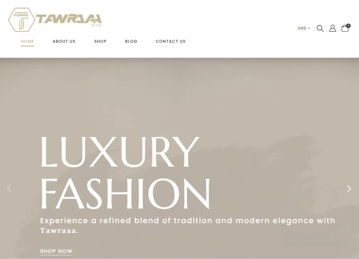 Gold/beige header with hexagonal logo (Tawraaa in Bengali/English), currency selector (USD), search/cart/account icons; navigation (Home, About Us, Shop, Blog, Contact Us); hero with refined background, tagline "LUXURY FASHION" and "Experience a refined blend of tradition and modern elegance with Tawraaa", plus "SHOP NOW" CTA.