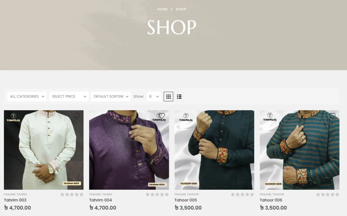 Clean product showcase with filters (All Categories, Select Price, Default Sorting), grid layout displaying panjabi/kurta items (e.g., Tahrim 003–006, Tahoor 005–006) with high-res photos (full outfit/close-ups of embroidery/cuffs), prices in BDT (৳3,500–৳4,700), star ratings, and "Add to Cart"/wishlist icons.