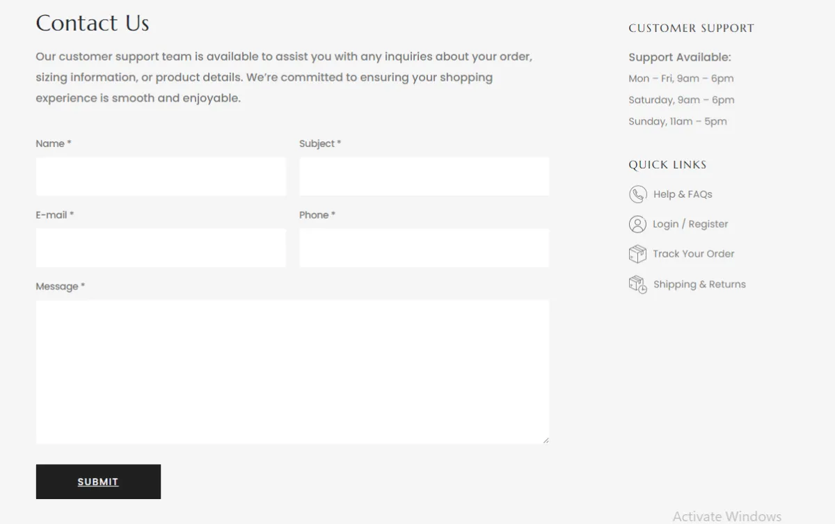Form with fields (Name*, Email*, Phone*, Subject*, Message*, Submit), support hours (Mon–Fri 9am–6pm, Sat 9am–6pm, Sun 11am–5pm), quick links (Help & FAQs, Login/Register, Track Order, Shipping & Returns), and emphasis on smooth shopping experience.