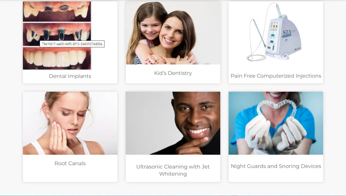 Grid of key treatments (Implants, Kid's Dentistry, Pain-Free Injections, Root Canals, Ultrasonic Whitening, Night Guards) with images.