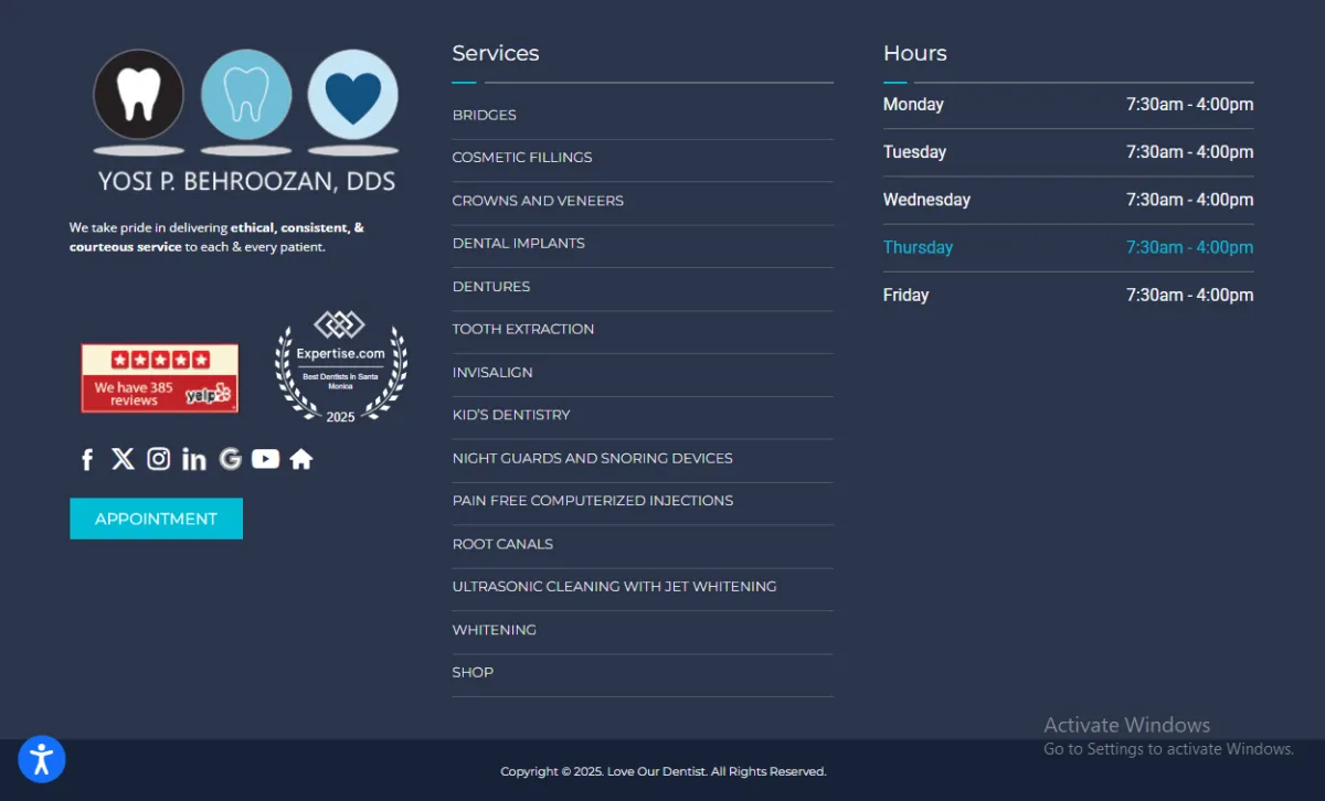 We updated the footer/sidebar for Dr. Yosi P. Behroozan, DDS's website with a dark navy design featuring logo, ethical service tagline, high Yelp/Expertise.com badges, full services list, office hours, social icons, and a prominent "APPOINTMENT" button for easy booking and trust-building.