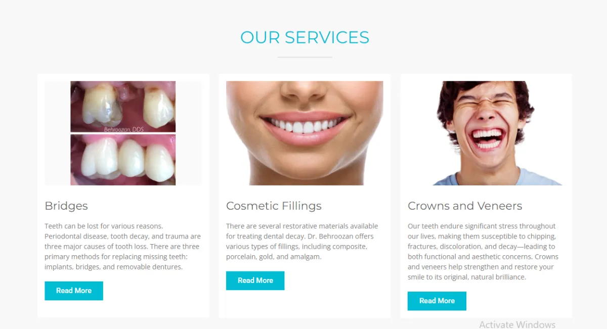 Card layout for Bridges, Cosmetic Fillings, Crowns/Veneers with before/after photos, descriptions, and "Read More" links.