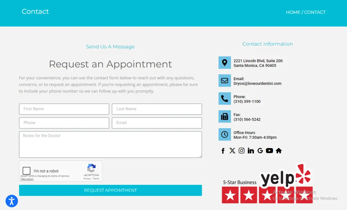 Appointment request form (Name, Phone, Email, Notes, reCAPTCHA) + contact details, social links, and Yelp 5-star badge.