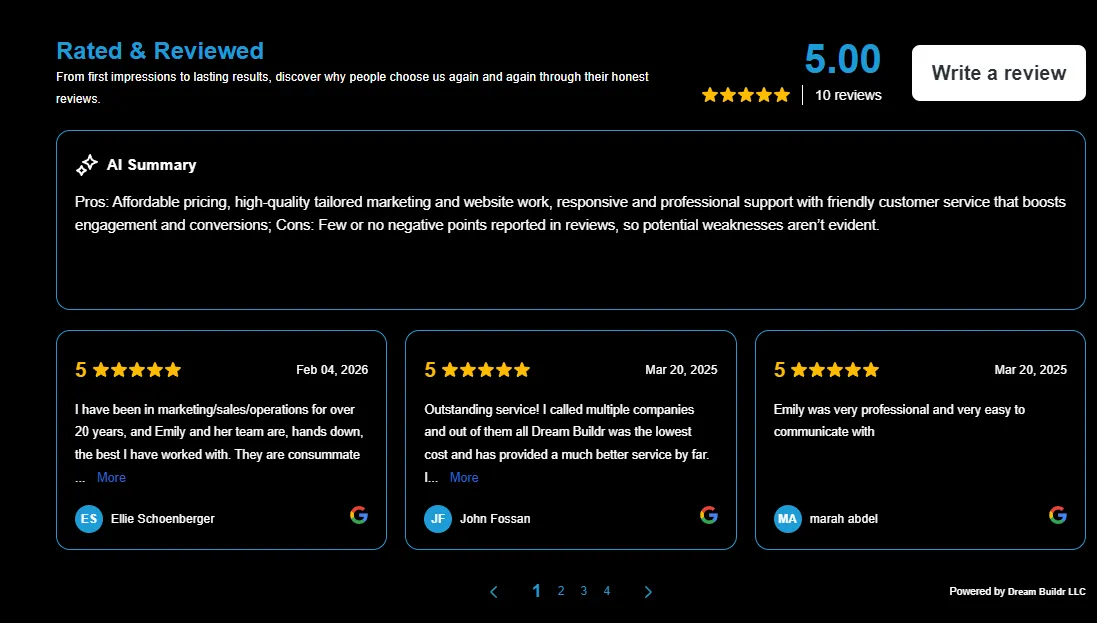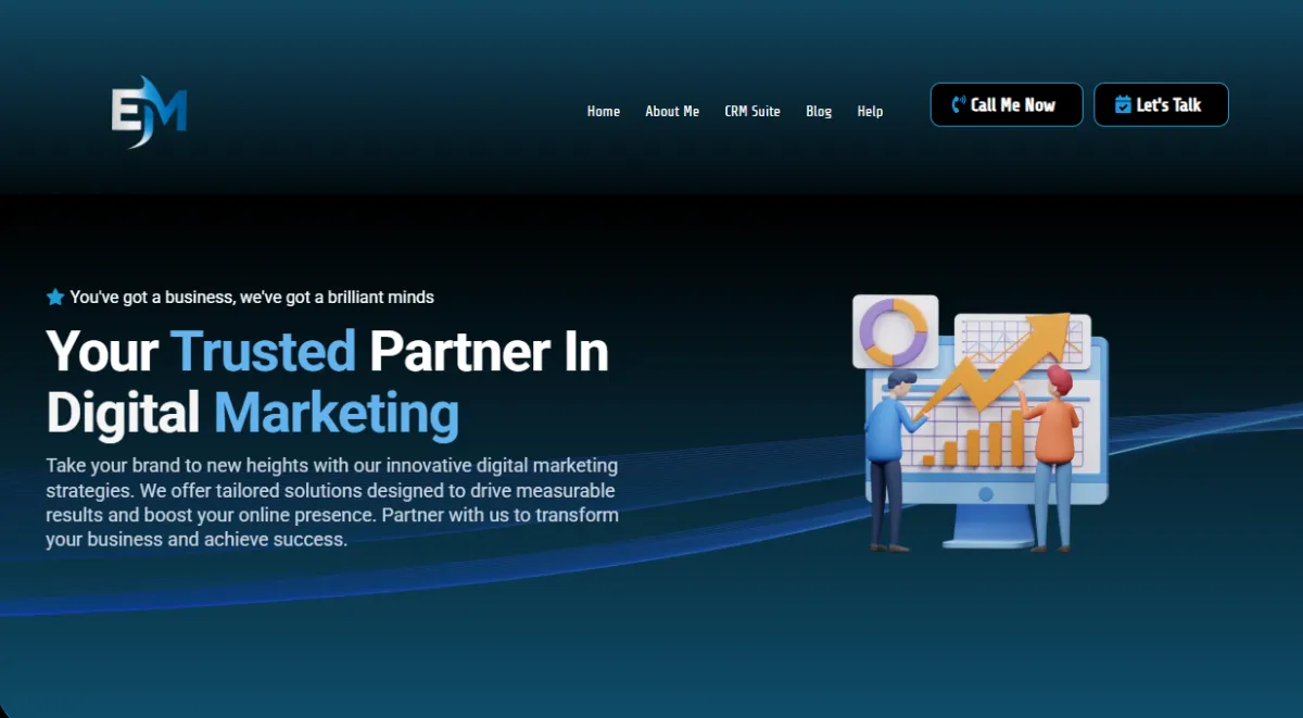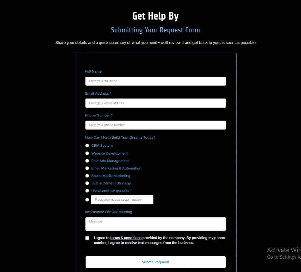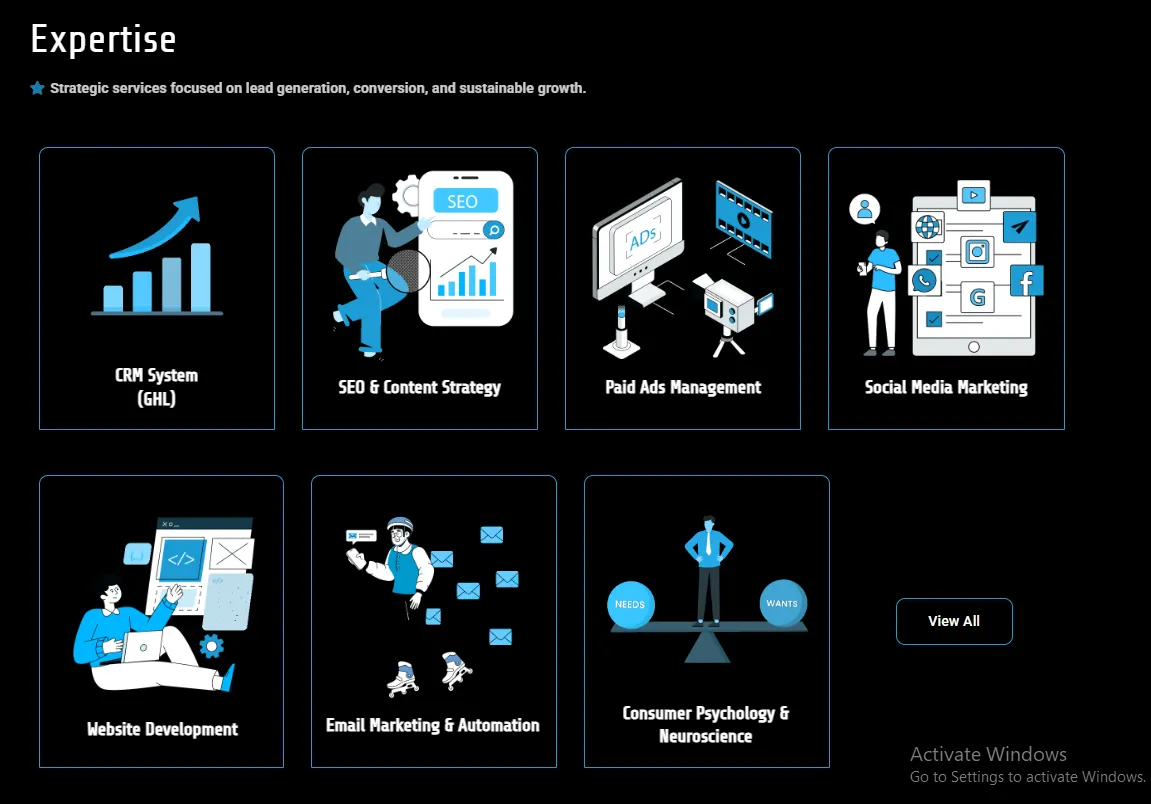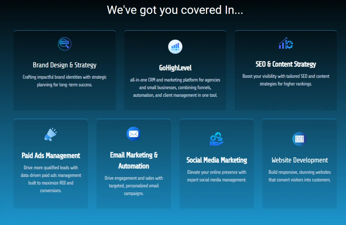 Dark cards showcasing expertise — Brand Design & Strategy, GoHighLevel (all-in-one CRM/marketing platform), SEO & Content Strategy, Paid Ads Management, Email Marketing & Automation, Social Media Marketing, Website Development — with icons, descriptions, and benefit highlights (lead gen, ROI, conversions).