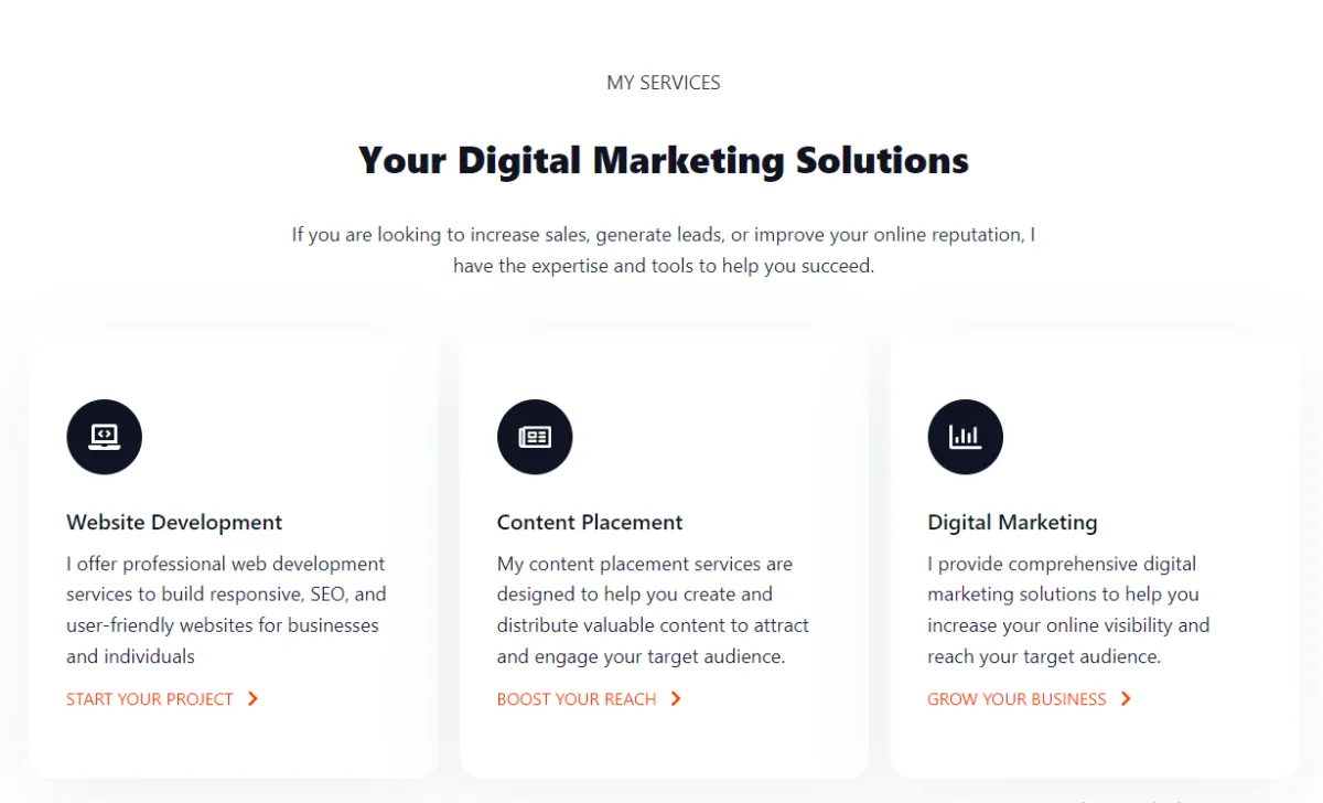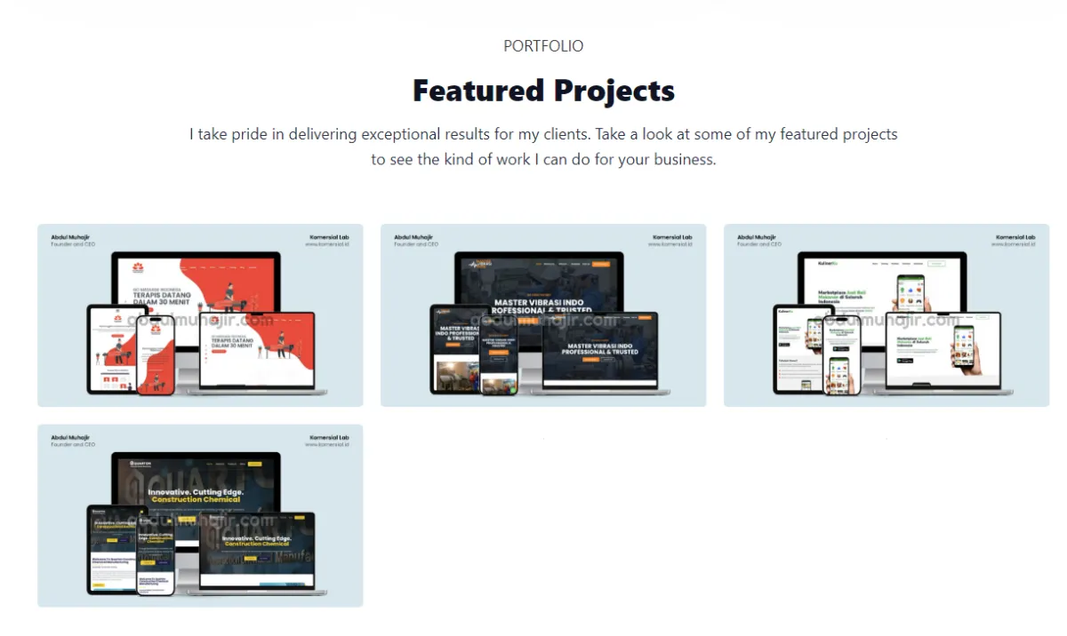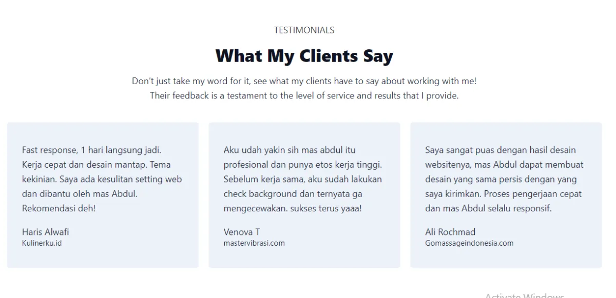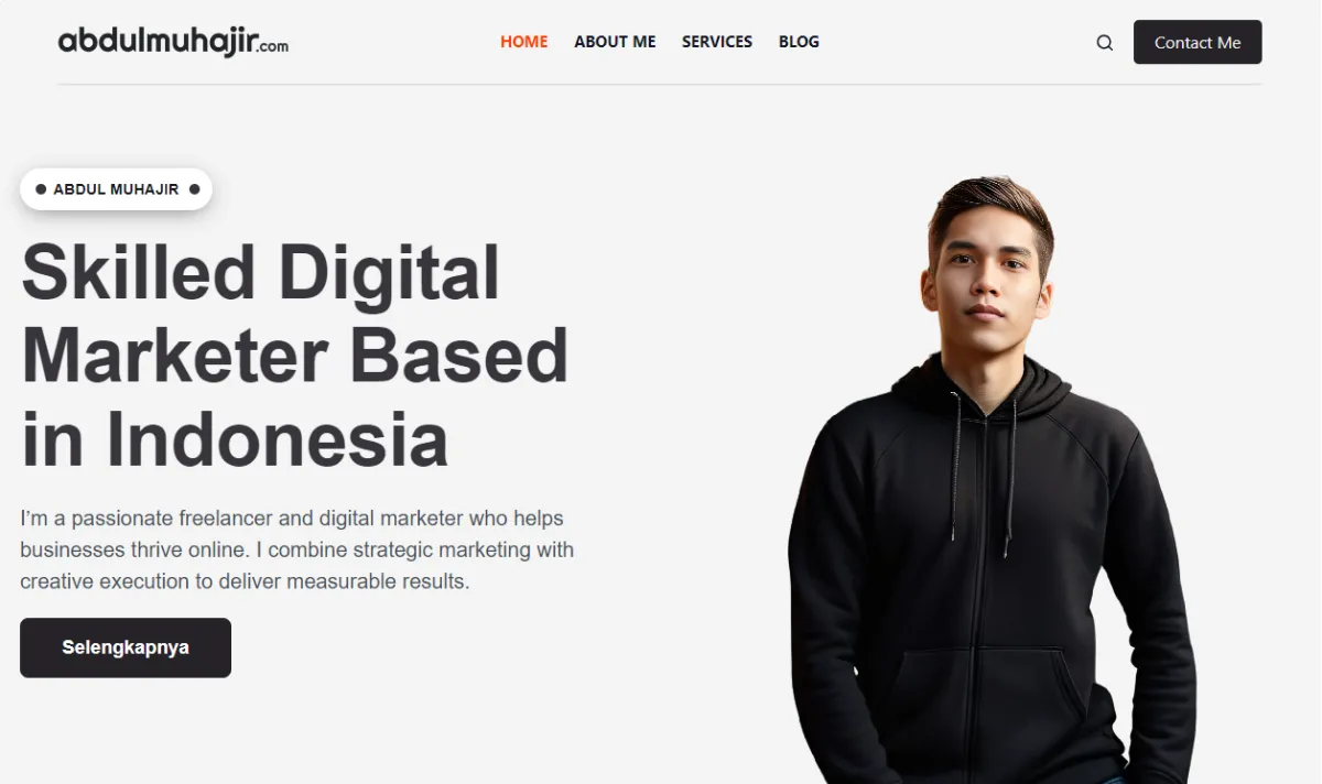 Clean header with logo, navigation (Home, About Me, Services, Blog, Contact), search icon, "Contact Me" button; hero featuring professional headshot, tagline "Skilled Digital Marketer Based in Indonesia", short bio on helping businesses thrive online via strategic/creative marketing, and "Selengkapnya" (Learn More) CTA.