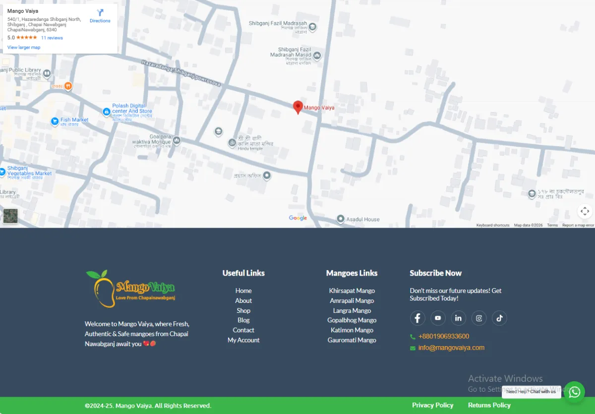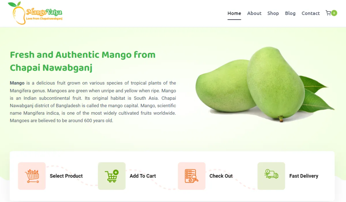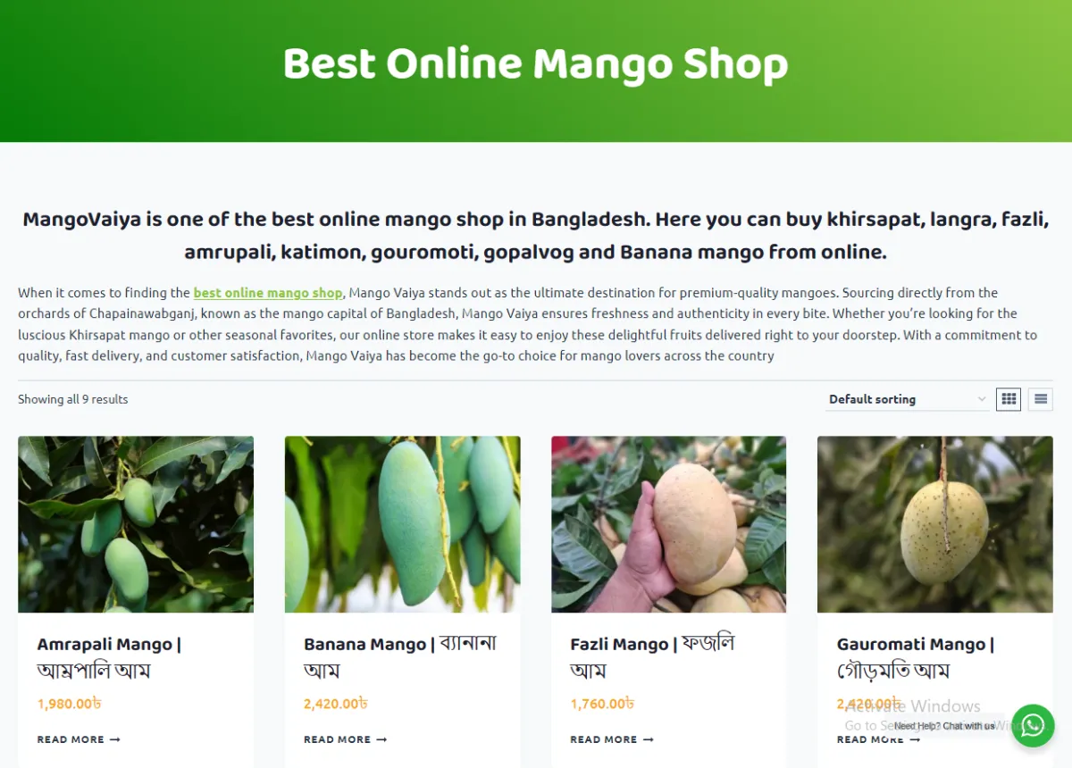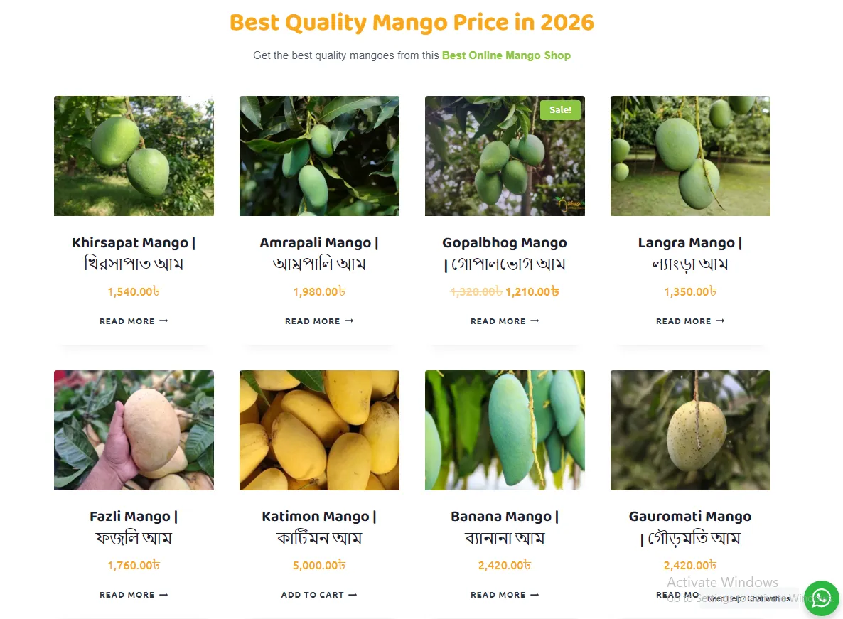 Grid showcase of mango varieties with prices in BDT (e.g., Khirsapat ৳1,540, Amrapali ৳1,980, Gopalbhog ৳1,320-৳4,320, Langra ৳1,350, Fazli ৳1,760, Katimon ৳5,000, Banana ৳2,420, Gauromati ৳2,420), orchard photos, "Sale" badges, "Read More"/"Add to Cart" buttons, and "Best Quality Mango Price in 2026" headline promoting the best online mango shop.