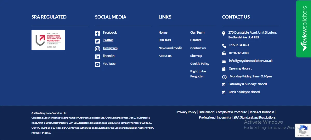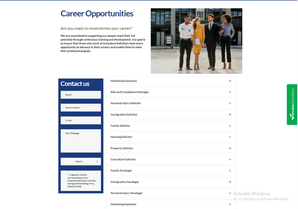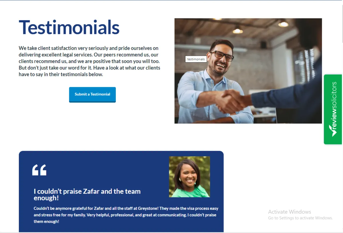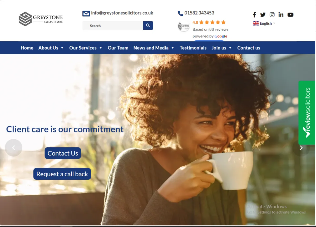 Included contact info (email/phone), social icons, Google Reviews, navigation (Home, About Us, Services dropdown, Team, News/Media, Testimonials, Join Us, Contact), hero with warm client photo, "Client care is our commitment" tagline, and CTAs for contact/call-back.
