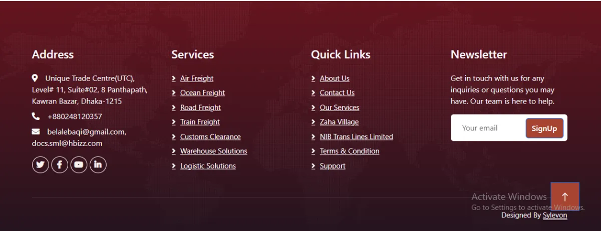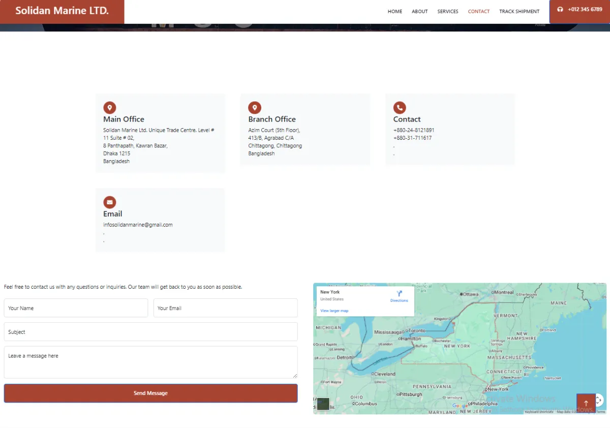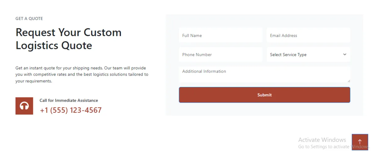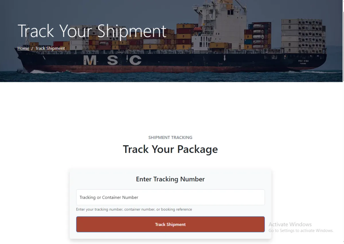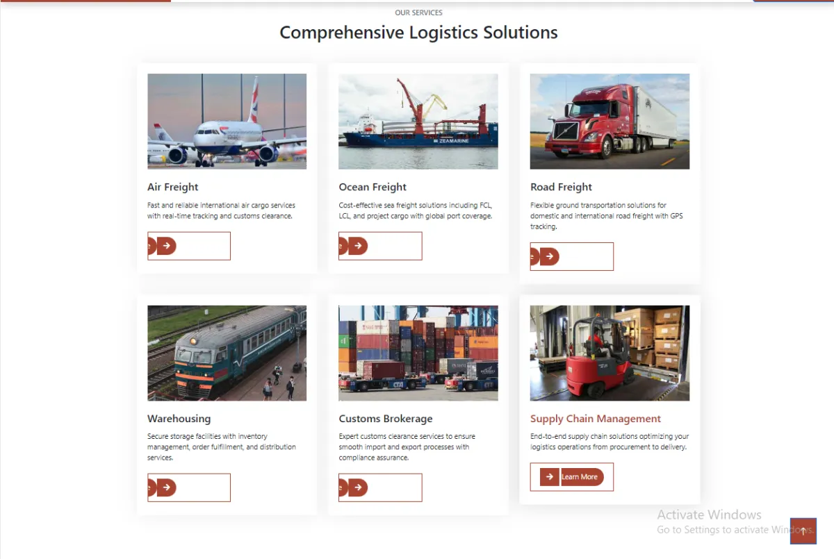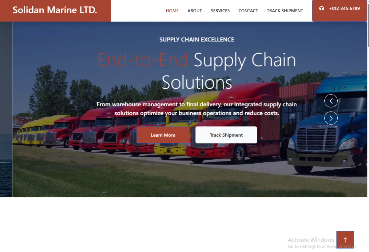 Designed header with logo, navigation (Home, About, Services, Contact, Track Shipment), phone, hero featuring truck fleet background, tagline "Supply Chain Excellence" and "End-to-End Supply Chain Solutions", description of integrated services (warehouse to delivery, cost optimization), plus "Learn More" and "Track Shipment" CTAs.
