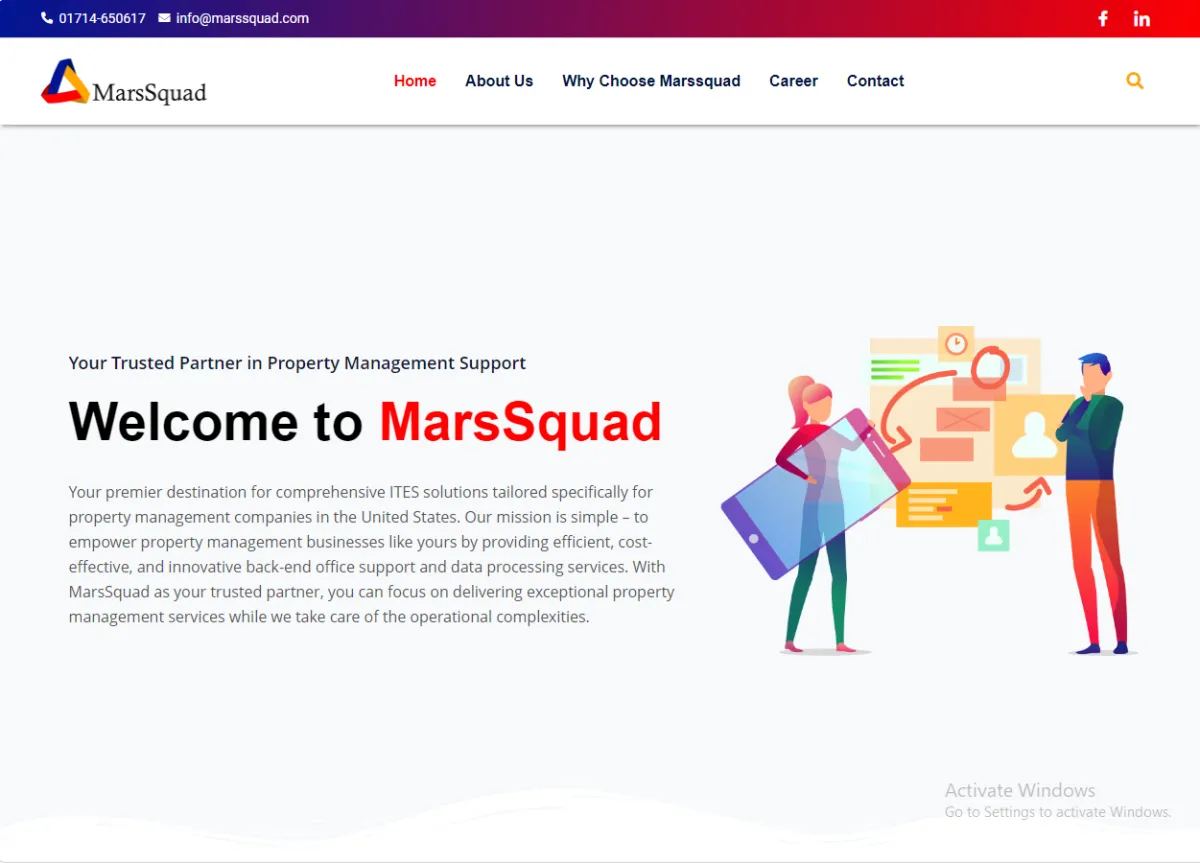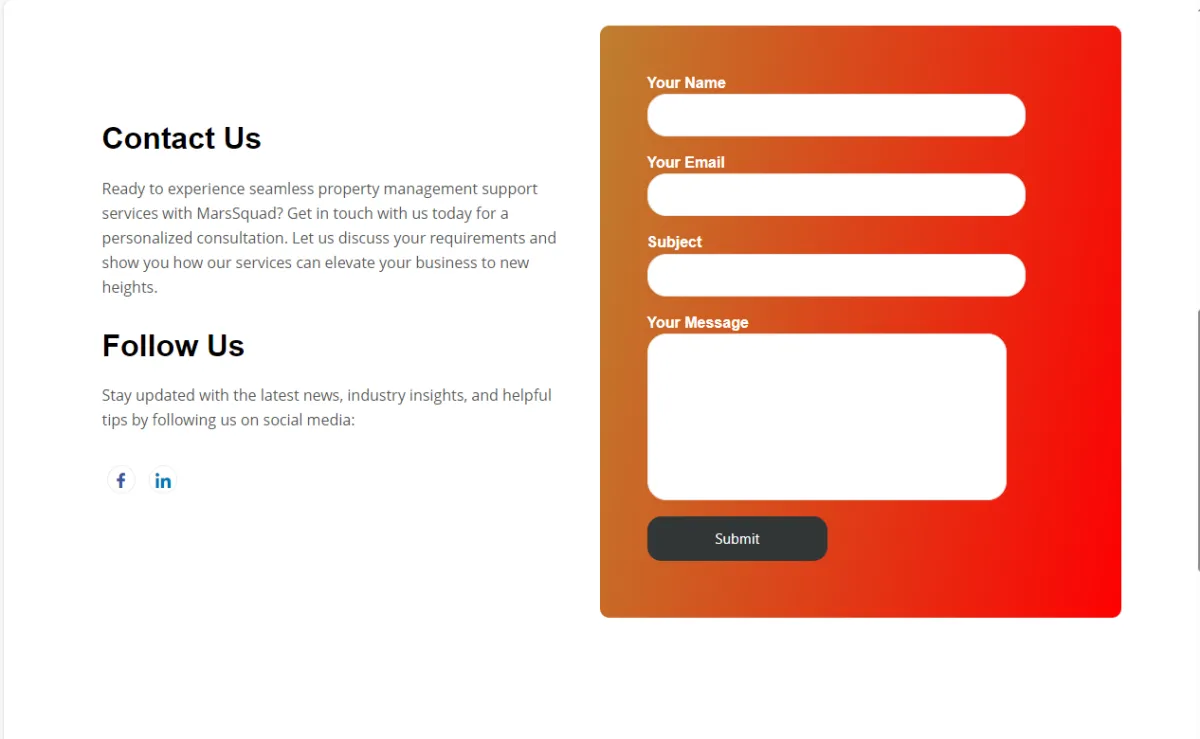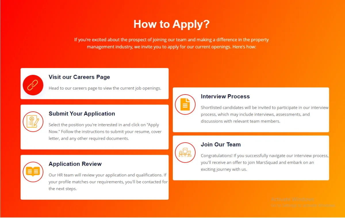 Designed a contact form with fields for Name, Email, Subject, Message, and Submit button, plus "Follow Us" social links; created a "How to Apply?" careers process with step-by-step cards (Visit Careers Page, Submit Application, Application Review, Interview Process, Join Our Team) to attract talent.