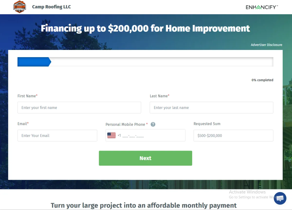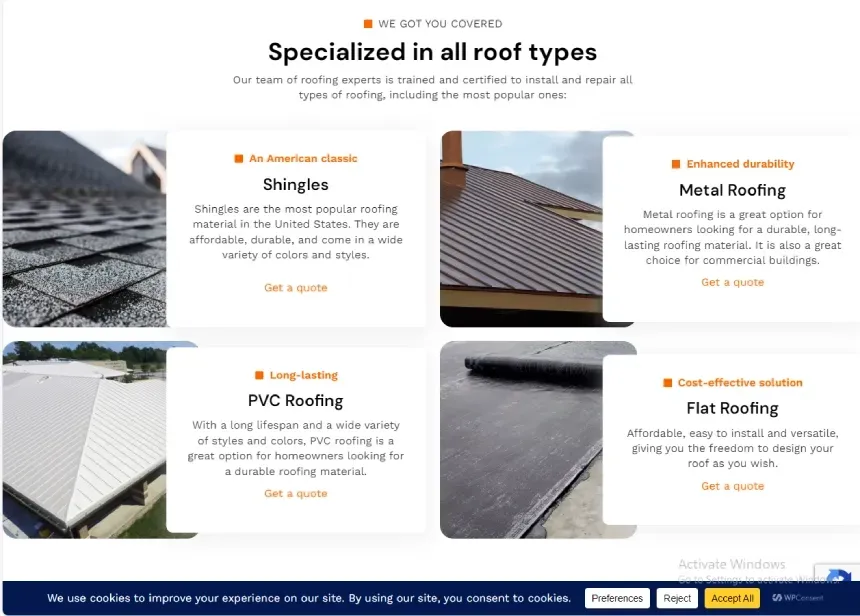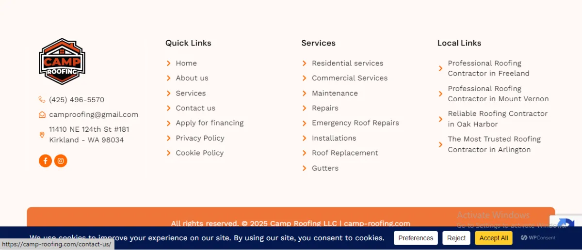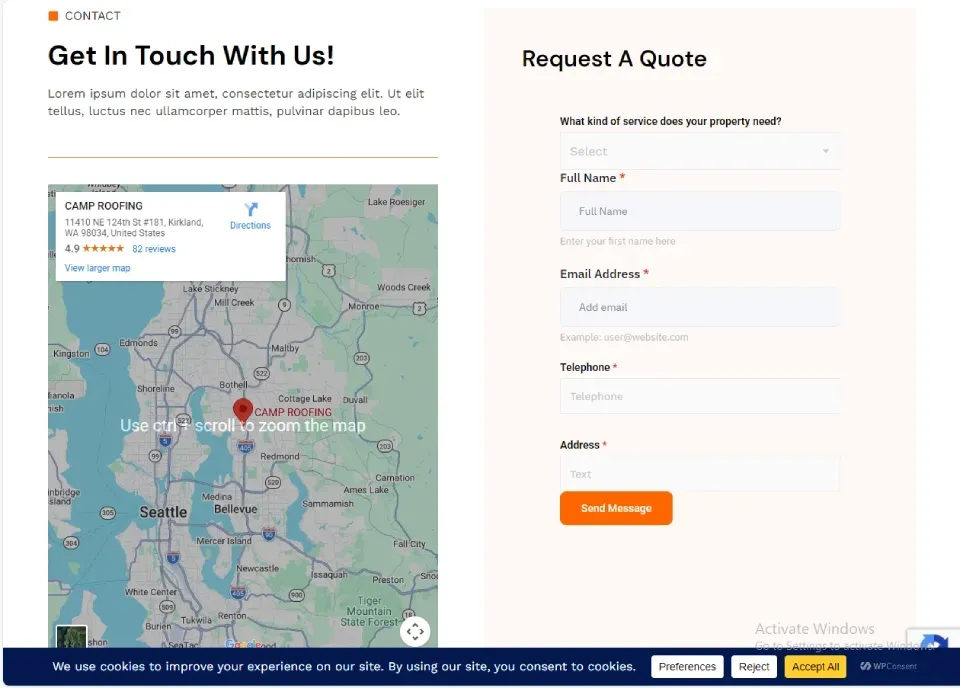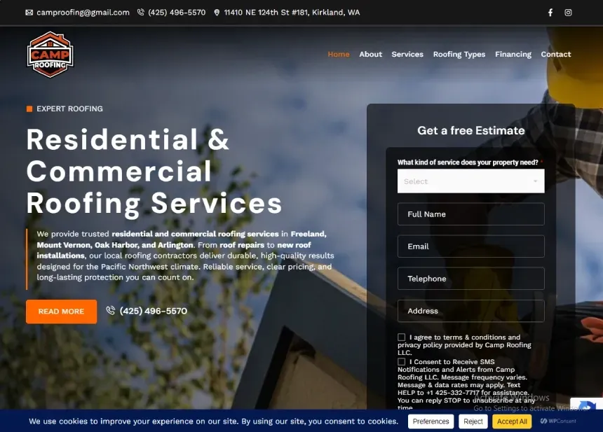 Added logo, navigation, contact info, service-area highlights, and a prominent free-estimate form with SMS consent. The "Get a free Estimate" hero form captures leads with a service dropdown, required name/email/phone/address fields, terms/privacy + SMS consent checkboxes, and an orange submit button.