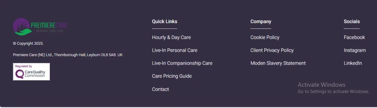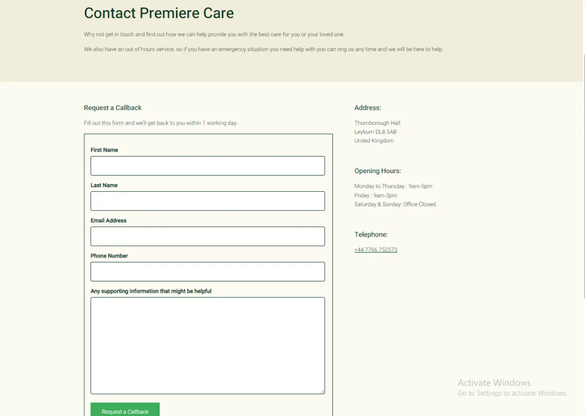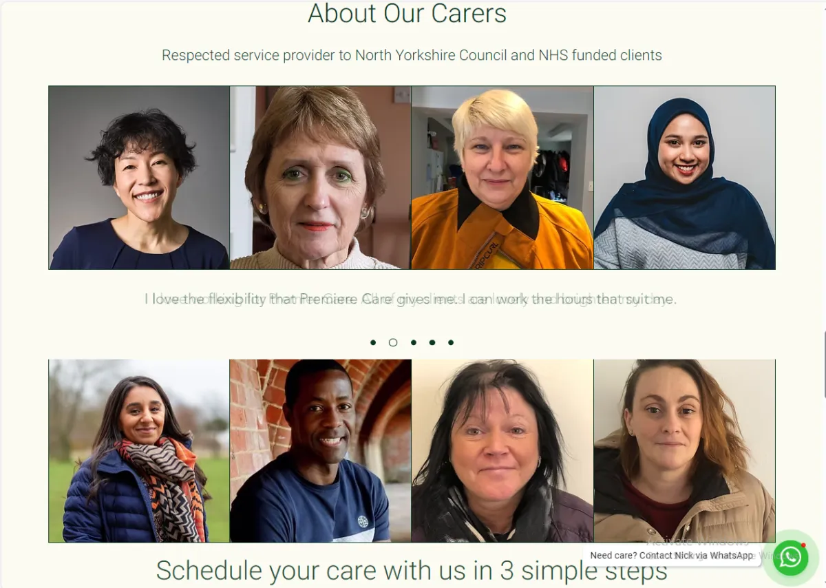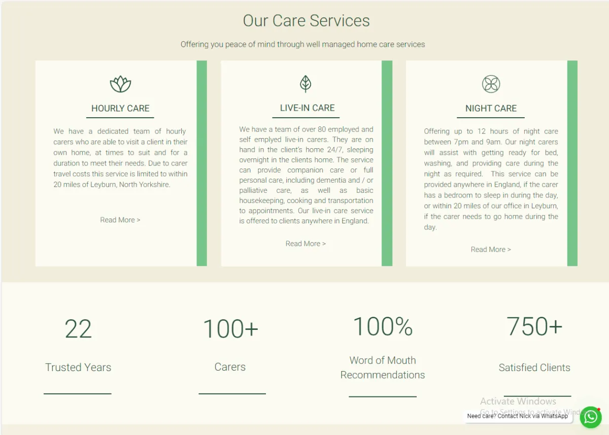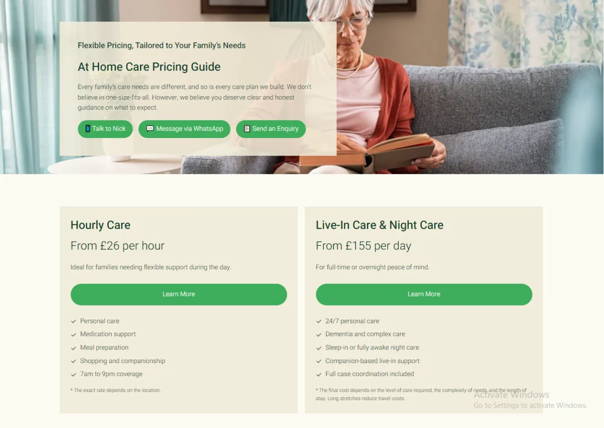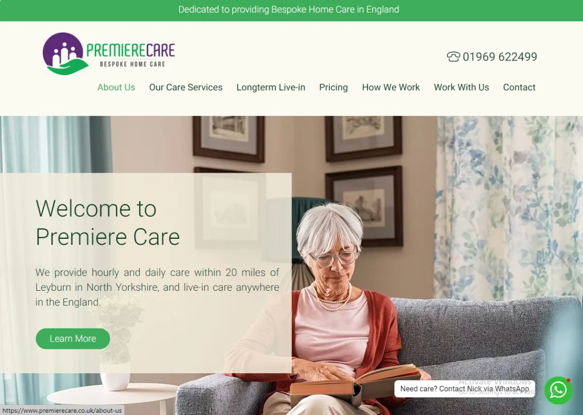 Added logo, green tagline, phone/WhatsApp, navigation (About, Services, Longterm Live-in, Pricing, How We Work, Work With Us, Contact), hero with elderly client photo, welcome on hourly/daily care within 20 miles of Leyburn and live-in anywhere in England, plus "Learn More" CTA.