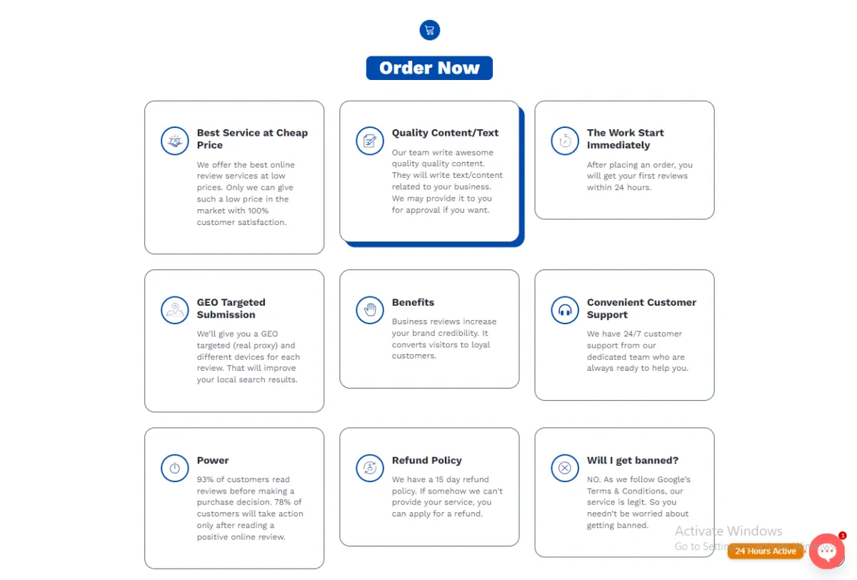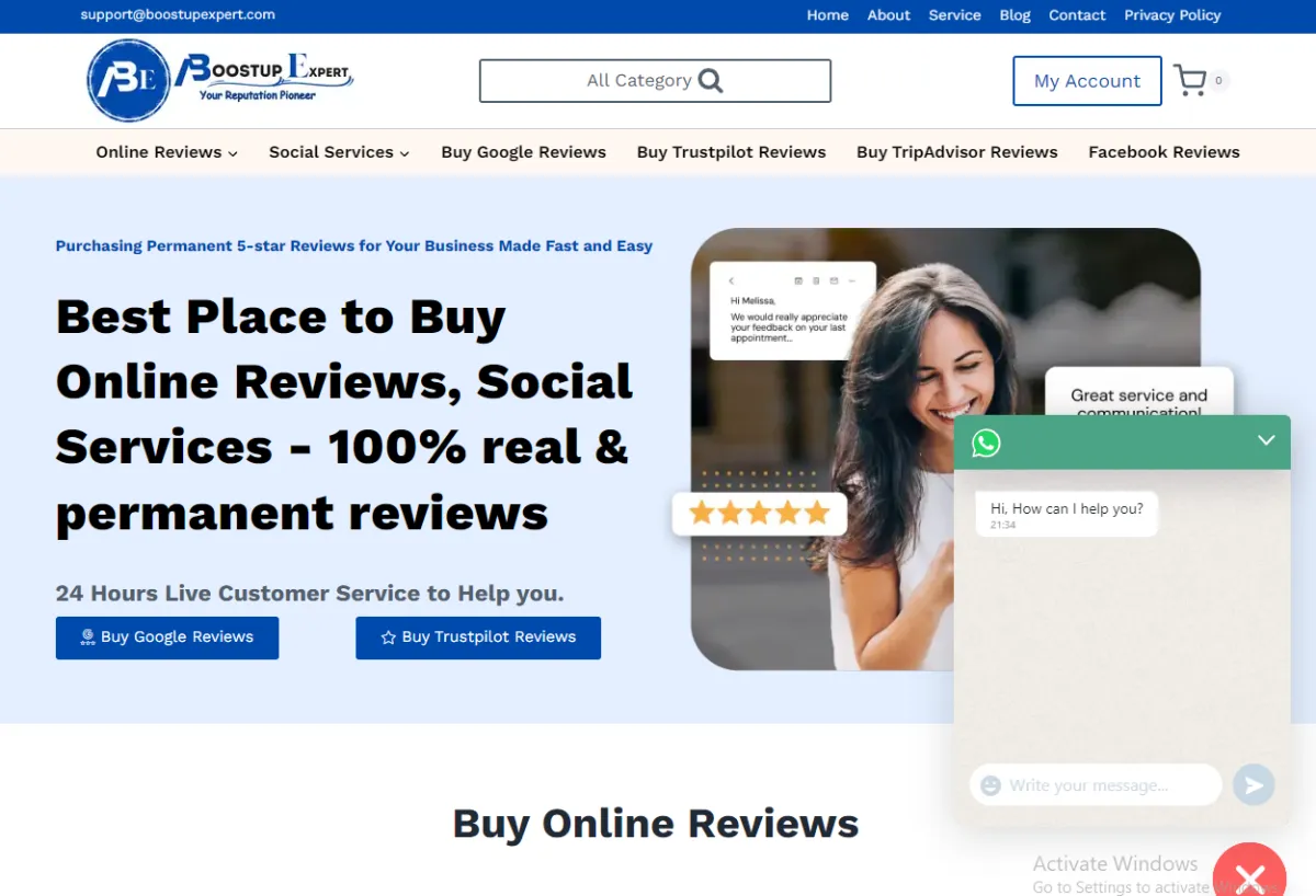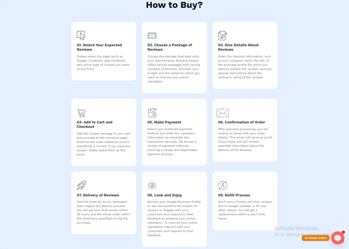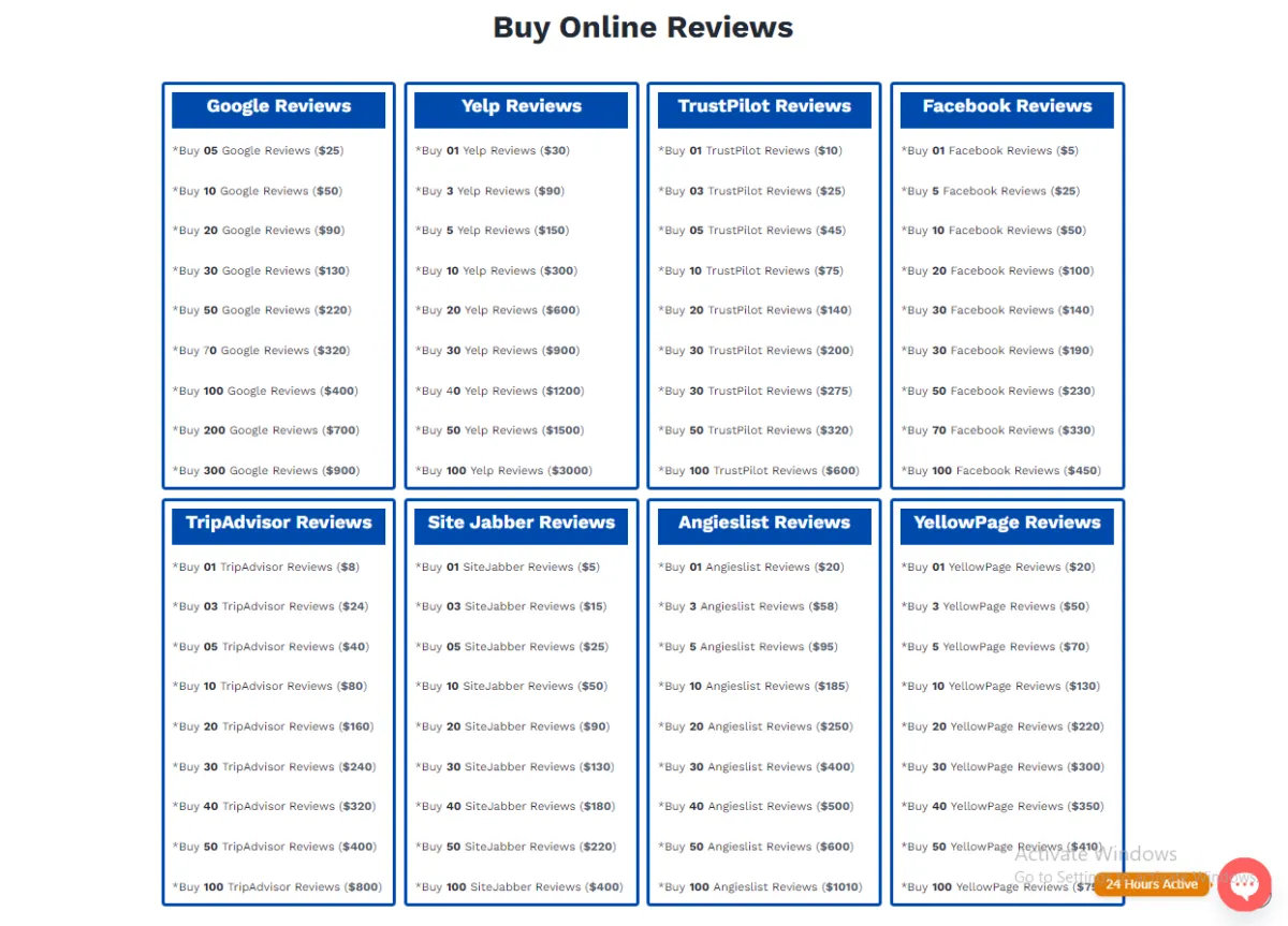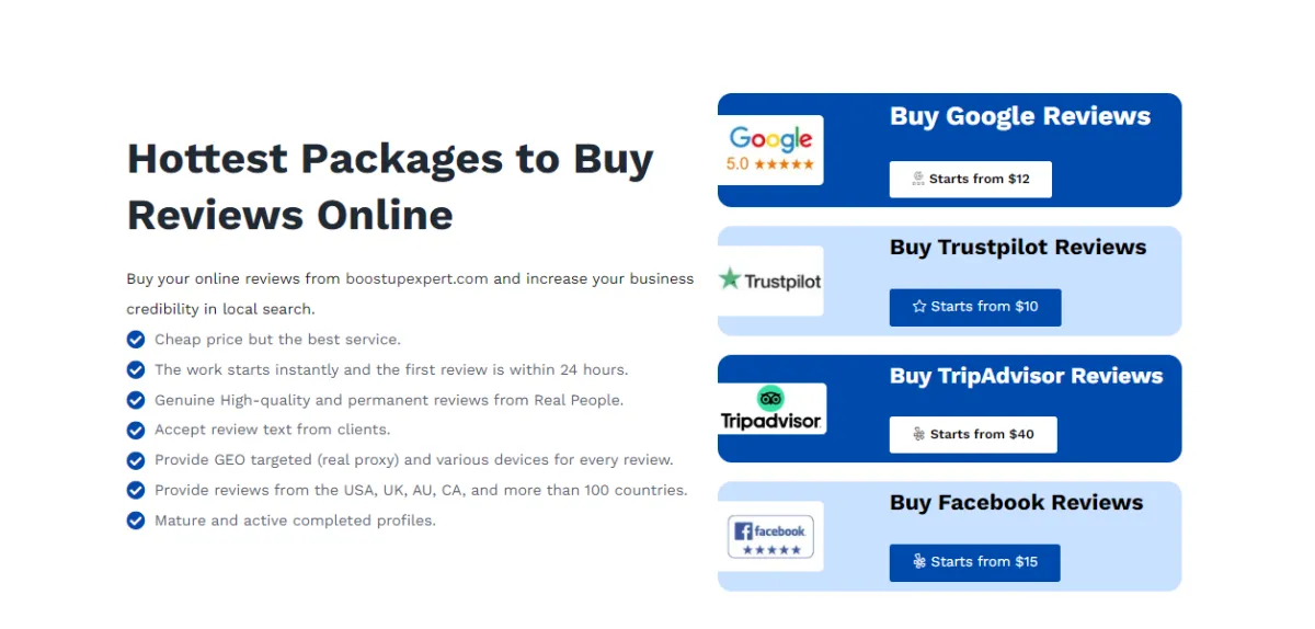 Highlighted featured cards (Google, Trustpilot, TripAdvisor, Facebook) with starting prices ($10–$40), bullet benefits (cheap/high-quality/permanent/GEO-targeted/24-hour delivery/mature profiles/100+ countries/no ban risk/refund policy), and "Order Now" flow graphic (7–9 steps: select, choose package, provide details, add to cart, pay, confirm, delivery, enjoy, refill if needed).